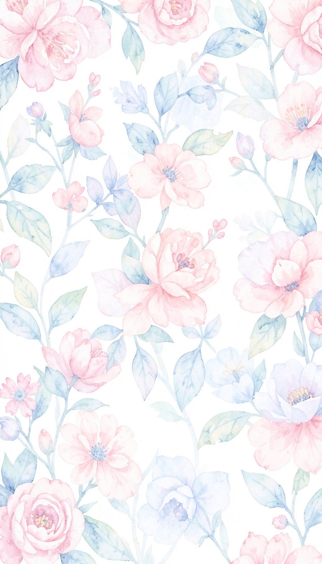 Este fondo de flores en acuarela pastel combina tonos suaves y formas delicadas, ideal para quienes buscan un diseño discreto y elegante. La mezcla de rosas y azules crea una atmósfera relajante, perfecta para darle un aire sofisticado a tu dispositivo sin sobrecargar la pantalla.