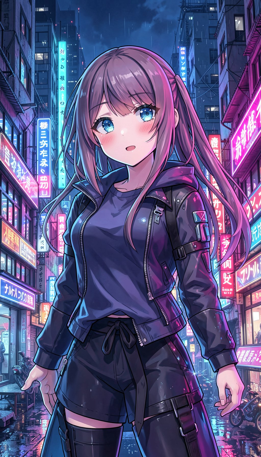 Dale a tu perfil un aire futurista con este fondo para WhatsApp perfil de una chica anime iluminada por luces neón en una ciudad moderna. Los colores brillantes y el detalle de la imagen resaltan en cualquier pantalla, ideal para quienes buscan un look sofisticado y actual.