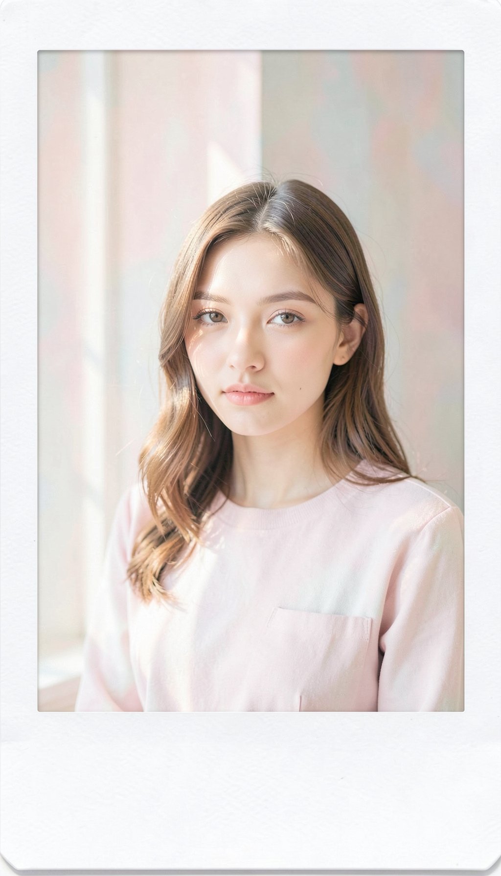 Esta imagen muestra una chica aesthetic en un marco tipo Polaroid, iluminada por luz suave y colores pasteles. Ideal para quienes buscan fotos de perfil aesthetic girl con un aire nostálgico y delicado, perfecta para destacar en cualquier fondo de pantalla.