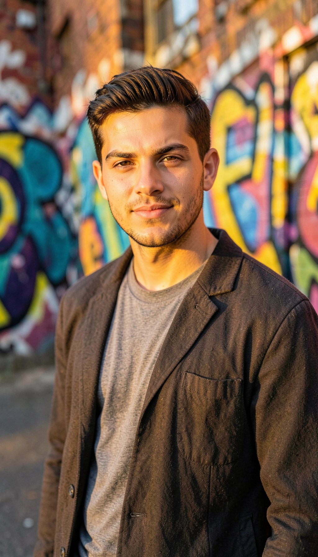 Esta imagen resalta el dinamismo del entorno urbano, perfecta para hombres que buscan fotos de perfil para hombres con un aire moderno y desenfadado. El fondo de grafiti aporta energía y vitalidad, mientras la luz dorada realza los rasgos, ideal para destacar en cualquier red social.