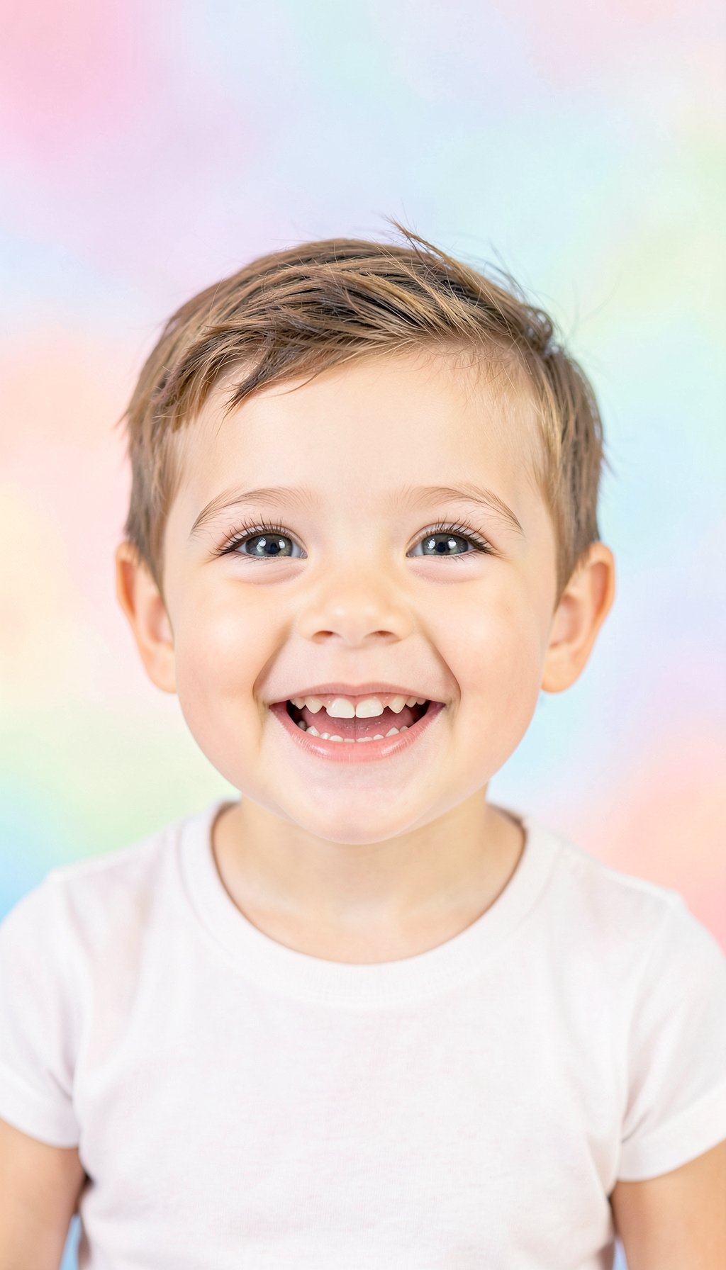 Esta imagen captura la esencia de la alegría infantil con una sonrisa llena de vida. El fondo en tonos pastel resalta el rostro del niño, ideal para quienes buscan fotos de perfil para niños que transmitan simpatía y ternura. La composición vertical la hace perfecta para dispositivos móviles.